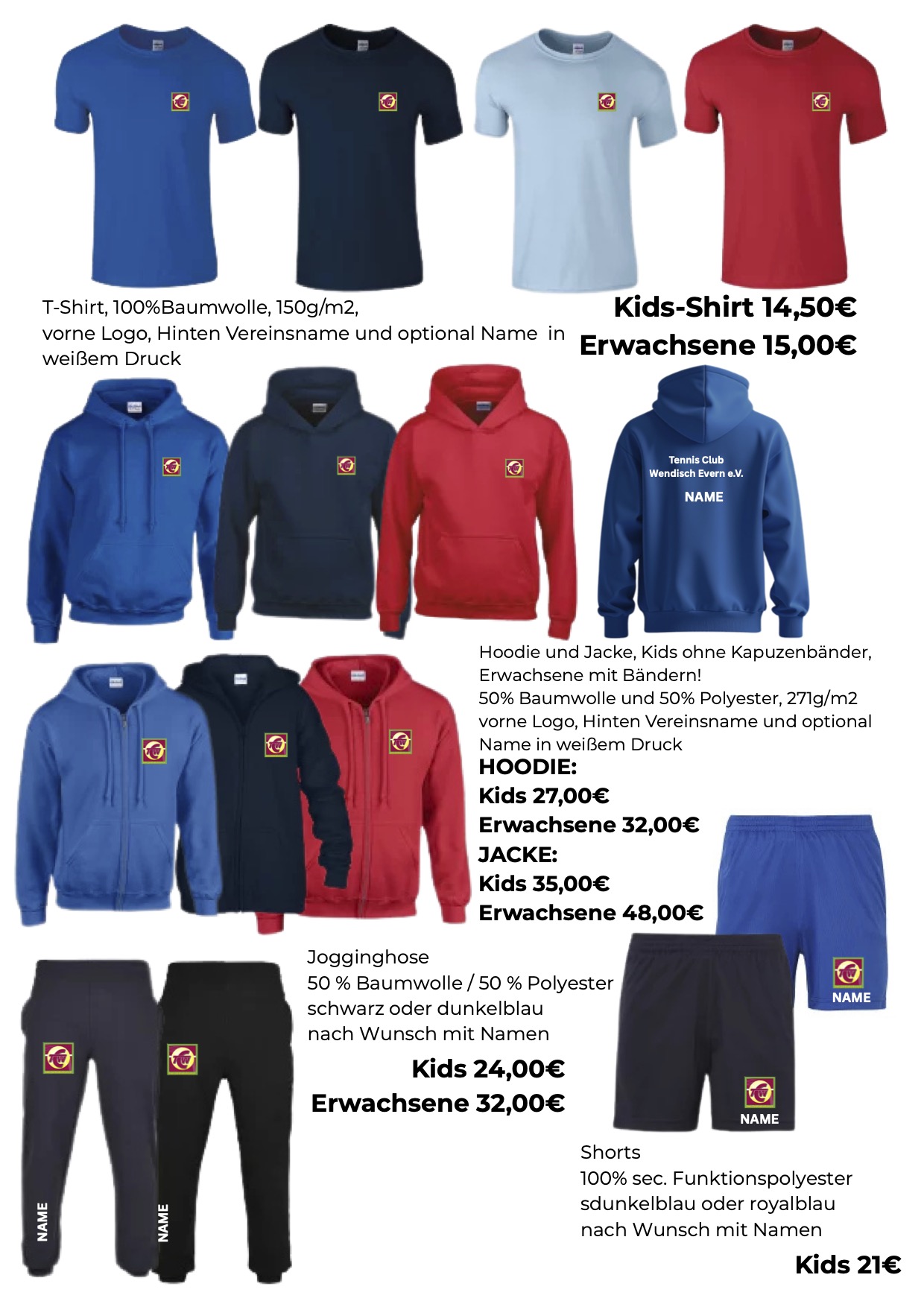 Wir freuen uns, euch unsere neue Vereinskollektion vorzustellen. Auf dem beigefügten Bild seht ihr die Musterexemplare der verfügbaren Artikel. Die Kollektion ist sowohl für Kinder als auch für Erwachsene erhältlich und trägt jeweils unser Vereinslogo.